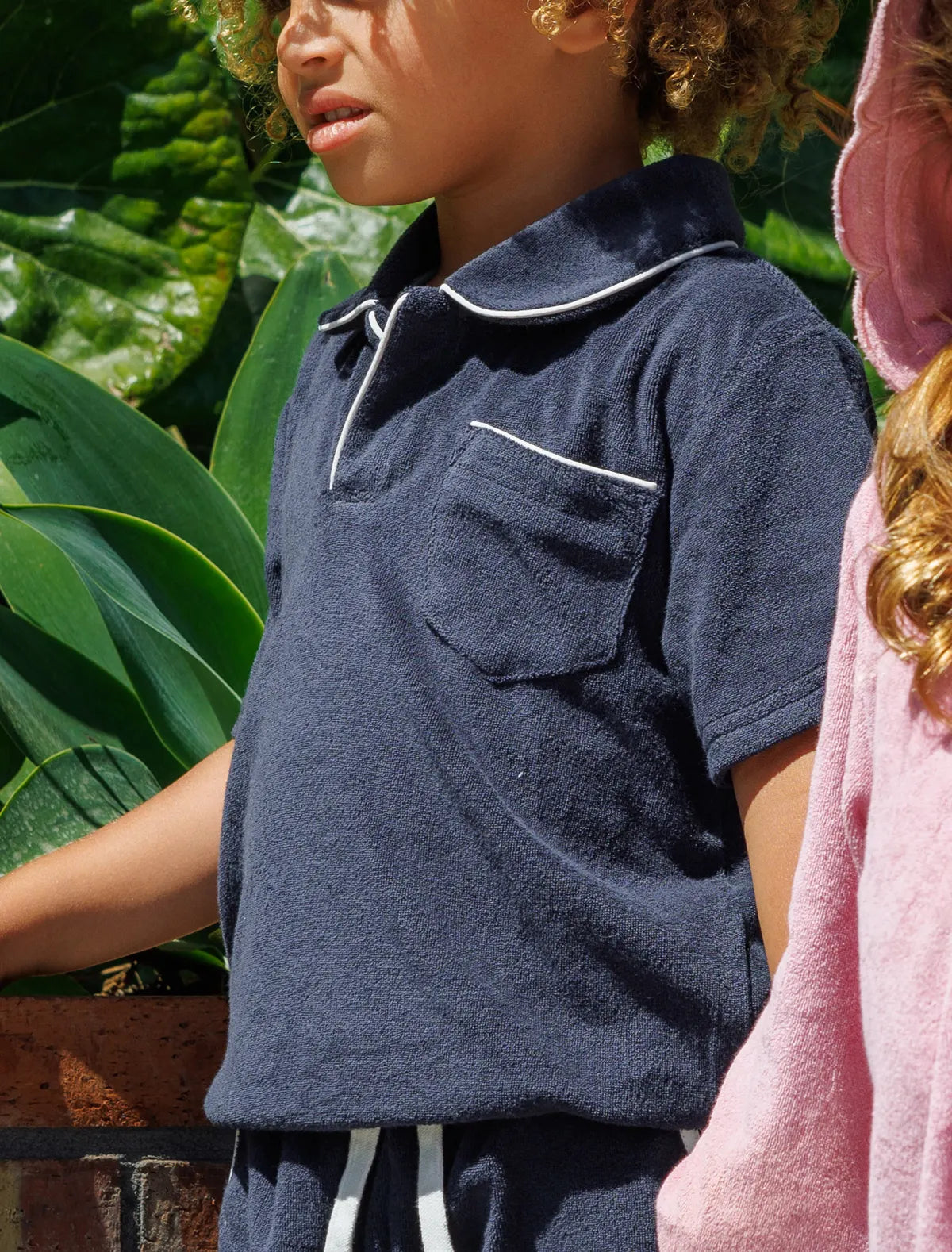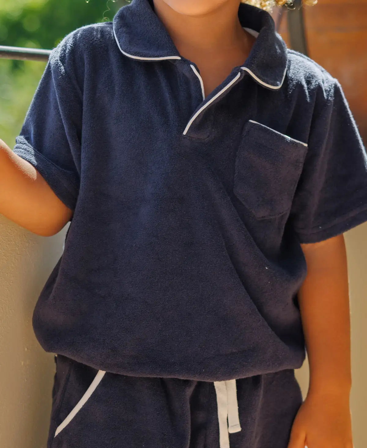A summer wardrobe addition that coordinates perfectly, this outfit features a classic French Terry Polo with a relaxed short sleeve design, an open collar, and a ribbed hem with crisp white piping, paired with ultimate terry towelling summer shorts. Designed in French Terry with a relaxed fit, these shorts are a staple for warm weather, ensuring your child looks stylish and feels comfortable all day long.