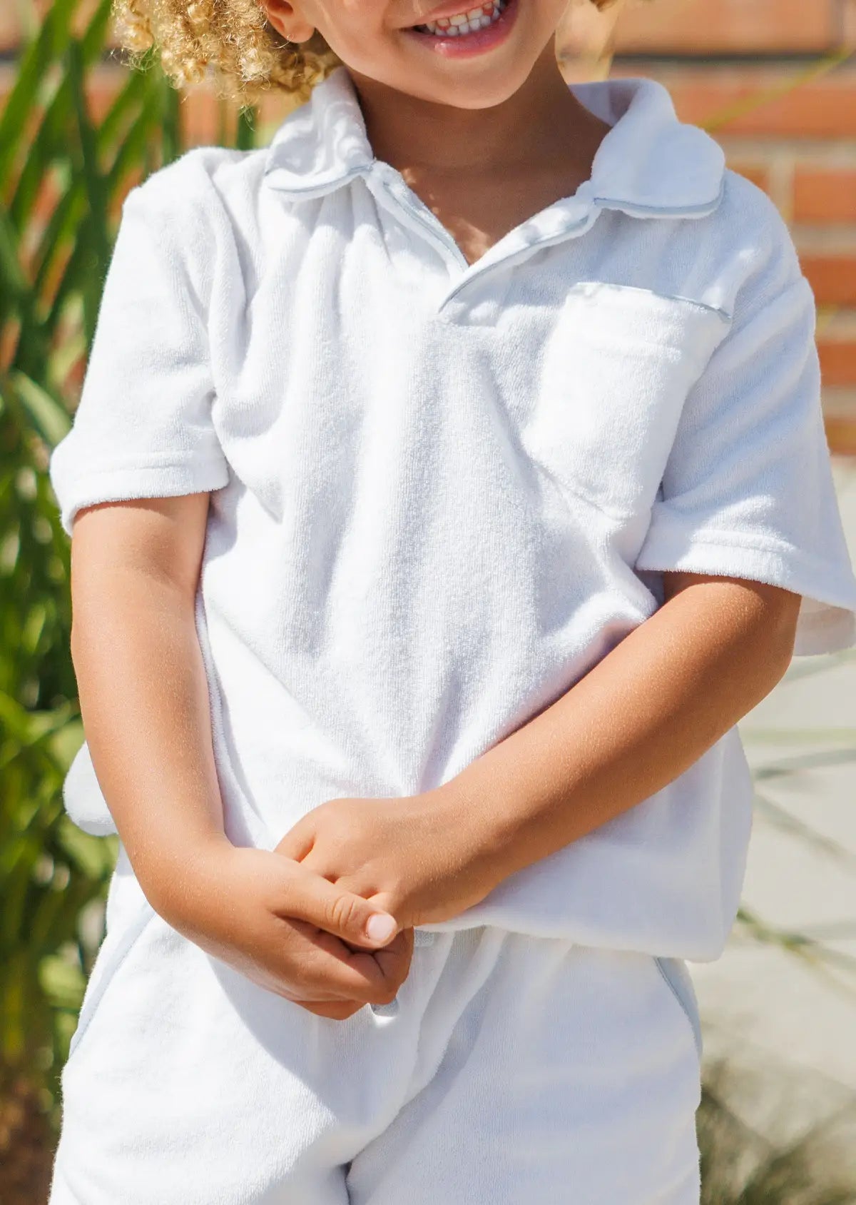 A summer wardrobe addition that coordinates perfectly, this outfit features a classic French Terry Polo with a relaxed short sleeve design, an open collar, and a ribbed hem with crisp white piping, paired with ultimate terry towelling summer shorts. Designed in French Terry with a relaxed fit, these shorts are a staple for warm weather, ensuring your child looks stylish and feels comfortable all day long.